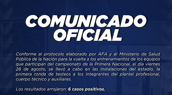 Según informó el doctor Fabio Sánchez, del Departamento Médico del club en un comunicado, «todos se encuentran asintómaticos y se procedió a la activación del protocolo correspondientes para su aislamiento, control y seguimiento domiciliario».