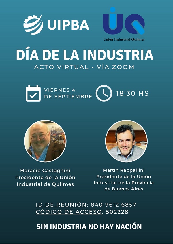 En el marco del Día de la Industria, que se celebra desde 1941 en conmemoración a que en 1587 se registró por primera vez una exportación nacional al exterior, la Unión Industrial Quilmes celebrará con un acto virtual que se transmitirá por zoom el viernes 4 de septiembre a las 18.