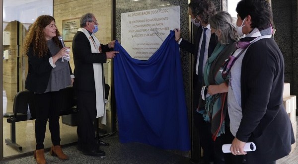 En el acto, los presentes descubrieron una placa en el ingreso a la SEDRONAR con la siguiente leyenda: “Al Padre Bachi (1968-2020), quien trabajó incansablemente acompañando con amor a nuestras pibas y nuestros pibes. ¡Que cuide esta institución!”.