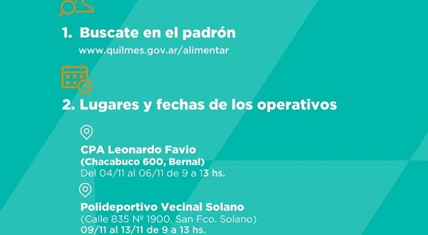El Municipio de Quilmes informa que desde el miércoles 4 hasta el viernes 20 de noviembre inclusive, se realizarán nuevos operativos de entrega de la tarjeta AlimentAR en distintos puntos del distrito.