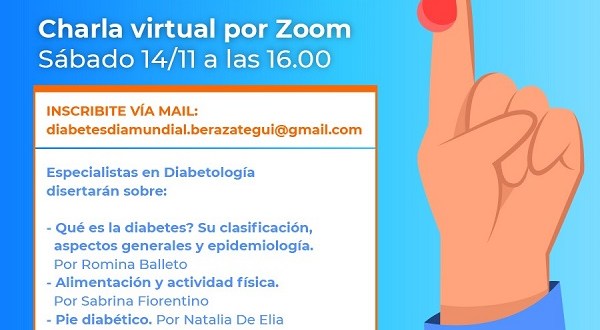 Este sábado 14 de noviembre, la Municipalidad de Berazategui conmemorará el Día Mundial de la Diabetes con una charla virtual a través de la plataforma Zoom. La jornada comenzará a partir de las 16.00 y, fundamentalmente, tendrá como objetivo concientizar a los vecinos sobre cómo prevenir y tratar esta enfermedad.
