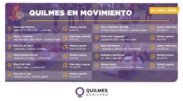 “El programa Quilmes en Movimiento tiene como objetivo central promover la actividad física en los vecinos y vecinas. En esta primera etapa, se busca llegar a diferentes puntos del distrito, en espacios públicos y al aire libre. Más adelante, cuando las cuestiones sanitarias lo permitan, el programa continuará creciendo en clubes, sociedades de fomento y centros de jubilados, entre otros”, detalló Mellino.