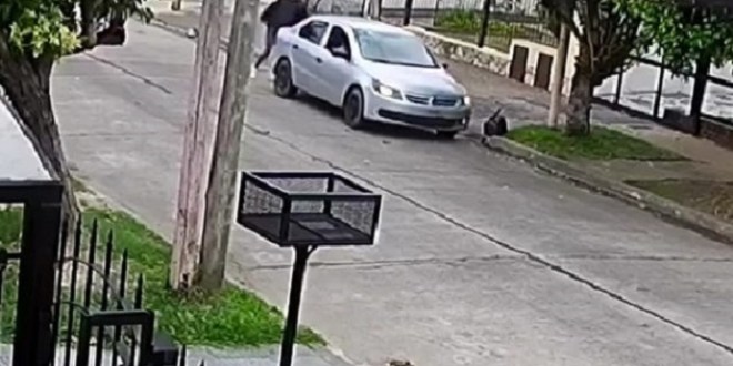 Un video de una cámara de seguridad captó el momento en que la victima fue abordada por los malvivientes, que circulaban a bordo de un auto. A su vez, cuando escaparon el acompañante le efectuó un disparo que no le llegó a impactar.