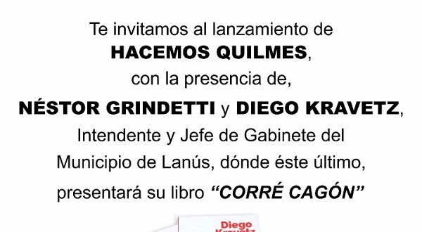 El evento contará con la presencia del intendente de Lanús, Néstor Grindetti, y su jefe de Gabinete, Diego Kravetz quien presentará su libro «Corré cagón», referente de Hacemos de la Tercera Sección Electoral.