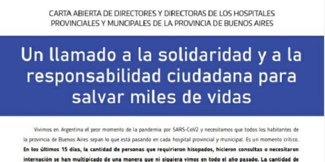 Directores de hospitales bonaerenses, entre ellas el doctor Juan Fragomeno y el doctor Matias Gallastegui, directores del Hospital de Quilmes y del de Solano respectivamente, llamaron a la «responsabilidad ciudadana para salvar miles de vidas» ya que, advirtieron, el país está en el «peor momento» de la pandemia.