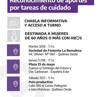 El Municipio de Quilmes informa que desde mañana, 2 de agosto y hasta el 13, de lunes a viernes en el horario de 8.30 a 14, se desarrollará un operativo especial para el ingreso al Programa Integral de Reconocimiento de Períodos de Aporte por Tareas de Cuidado, impulsado por la ANSES, en el Polideportivo Municipal Reinaldo Gorno, ubicado en Vicente López y Lafinur, Quilmes Oeste, con acceso a 120 turnos adicionales por día (se suspende por lluvia).
