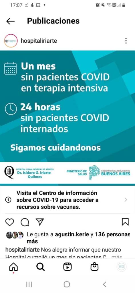 El Hospital Iriarte de Quilmes anunció que hoy se cumplió un mes sin pacientes COVID internados en terapia intensiva.