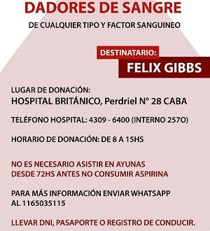 Para dicho tratamiento se necesitan 50 dadores de sangre de cualquier tipo y factor. Quien pueda hacerlo deberá acercarse al Hospital Británico (Pedriel 28, Ciudad de Buenos Aires) de lunes a viernes de 8.00 a 15.00, sin ayuno previo. Es necesario presentarse con identificación, tener entre 18 y 65 años, y no haber consumido aspirinas en las últimas 72 horas. Para más información, comunicarse al 4309-6400 (interno 2570).