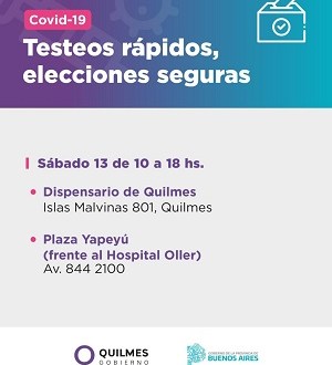 Bajo la consigna «Testeos rápidos, elecciones seguras» se realizarán hoy testeos en el Dispenario Ramón Carrillo (Islas Malvinas y Torcuato de Alvear) y en la Plaza Yapeyú ( 844 y 893) de Solano.