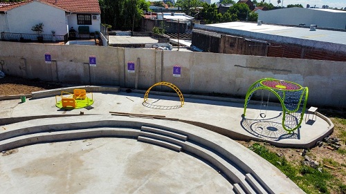 Durante los últimos días se estuvieron terminando los trabajos de colocación e instalación de juegos en la plaza, además del replanteo para realizar la carpeta de nivelación en la zona de la esquina. También se estuvo ejecutando la colocación de baldosas.