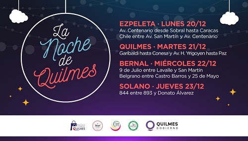 – Martes 21/12: “La Noche de Quilmes”, en el perímetro de las calles Garibaldi, Hipólito Yrigoyen, Conesa y Paz.