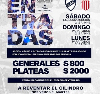 Mañana comienza la venta de las 15.800 entradas disponibles para los hinchas de Quilmes de cara al partido del próximo martes ante Barracas Central en la final por el segundo ascenso a la Primera Nacional que se disputará en el estadio de Racing.