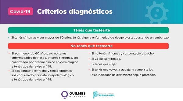 Se considera caso confirmado a quien reúna al menos un criterio epidemiológico (contacto estrecho de un caso confirmado en los últimos 10 días, haber participado de un evento en el que se hayan producido 3 o más casos o residir en zona de alta incidencia -como son todos los municipios del conurbano bonaerense, incluyendo Quilmes-), y 2 o más de los siguientes síntomas: fiebre, tos, dolor de garganta, dolor de cabeza/dolor corporal, dificultad para respirar vómitos/diarrea, congestión nasal, falta de olfato/ gusto.