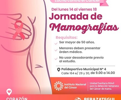 El Instituto Nacional del Cáncer, junto a la Municipalidad de Berazategui, dispondrá la Unidad Sanitaria Móvil para operativos de detección temprana del cáncer de mama. Se realizarán mamografías gratuitas para vecinas berazateguenses desde el lunes 14 hasta el viernes 18 de febrero, de 9.00 a 14.00, en el Polideportivo Municipal N° 4 (calle 164 e/ 29 y 30) del barrio Villa Mitre.
