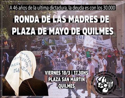 La Comisión Permanente de Homenaje Permanente a las Madres de Plaza de Mayo de Quilmes, convoca a la tradional Ronda de Madres de Plaza de Mayo de Quilmes que se realizará el vienres 18 de marzo a las 17.30.