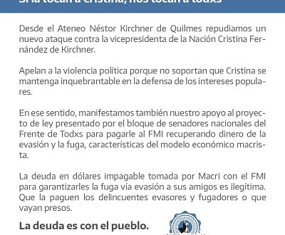 El Ateneo Néstor Kirchner de Quilmes emitió un comunicado en el que repudia el ataque contra la vicepresidenta Cristina Kirchner.