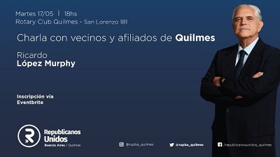 El diputado nacional Ricardo López Murphy de Republicanos Unido visitará a vecinos de Quilmes con el fin de hablar sobre liberalismo, la construcción del partido que puede plasmar estas ideas en las políticas públicas concretas y cuáles son los pasos para poder lograrlo.