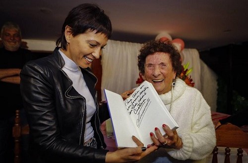 “En marzo de este año fuimos a visitar a Velia a su casa y compartimos un desayuno donde me comentó el cariño y admiración que tiene por Cristina. Hoy festejó sus 100 años con su familia y pasamos a saludarla y acercarle un ejemplar del libro Sinceramente, firmado especialmente por Cristina Fernández de Kirchner. Además, desde la Secretaría de Culturas y Deportes estaremos grabando junto con Velia un video con tres canciones que ella escribió. Gracias Velia por el cariño, por tus canciones y muy feliz cumple“, manifestó Mayra, quien fue acompañada por la secretaria de Niñez y Desarrollo Social, Florencia Di Tullio.