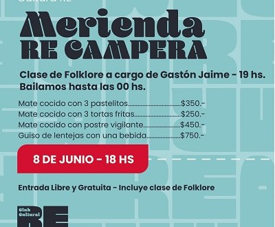 Las distintas opciones de merienda incluyen mate cocido con pastelitos, tortas fritas o postre vigilante o, para los que lleguen ya entrada la noche, un rico plato de lentejas. Club Cultural RE, te acerca una propuesta diferente para compartir con la familia o amigos. La entrada es libre y gratuita.