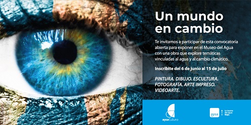Con motivo del Día Mundial del Medioambiente, y con la finalidad de apoyar y brindar un espacio de exhibición, encuentro y reflexión sobre el agua y el cambio climático AySA convoca a artistas visuales residentes en Argentina a presentar su obra para participar en la exhibición “Un Mundo en Cambio”. La muestra tendrá lugar en el Museo del Agua, Palacio de las Aguas Corrientes.