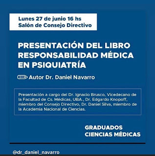 El reconocido psiquiatra, el quilmeño Daniel Alejandro Navarro presentará este lunes un nuevo libro, Responsabilidad Médica en psiquiatría. Será a las 16 en la Facultad de Medicina de Buenos Aires, con entrada libre y gratuita. La presentación estará a cargo del vicedecano, Ignacio Brusco, de Edgardo Knopoff, miembro del Consejo Directivo y de Daniel Silva, miembro de la Academia Nacional de la Ciencia.