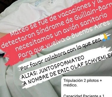 «Mií bebe, fue de vacaciones con su abuela y su tía a Bariloche, al tercer día de su estadía, lo notaron desganado y con mucho cansancio y dolor en sus brazos y piernas, lo llevaron al hospital interzonal de Bariloche y le comensaron a hacer estudios, los cuales salieron mal, lo dejaron 1 día internado y empeoro su cuadro, le hicieron todo tipos de estudios hasta dar con la enfermedad diagnósticada Gillian- Barre, es una enfemedad, la cual, no podemos trasladarlo en un avión normal, necesitamos un avión sanitario», manifestó Daniela desde la cuenta de instagram @juntospomateo28
