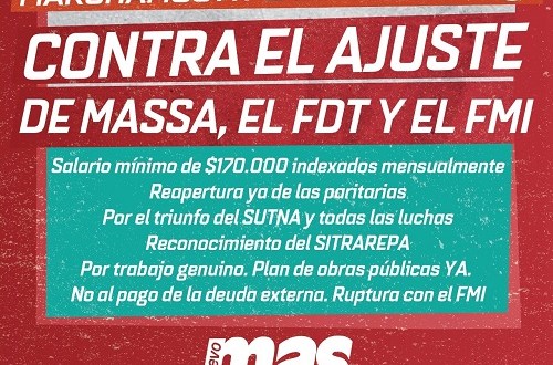 «El plan de ajuste del Frente de Todos, Massa y el FMI recae sobre los trabajadores y sectores populares. Massa se reúne con el campo, que ya fue beneficiado con el desdoblamiento del precio del dólar. Los banqueros y especuladores se llenan los bolsillos con el aumento de las tasas de los bonos del BCRA. Es decir, para los multimillonarios que se llevan los dólares que el país necesita con la fuga de capitales hay concesiones. Pero la política del gobierno hacia los trabajadores es eliminar las paritarias cuando el deterioro salarial es dramático, la precarización, el trabajo en negro y la pobreza crecen, a la vez que se despliega un ataque a los movimientos sociales independientes con la auditoría de la asistencia social, el sector más golpeado por la crisis.»