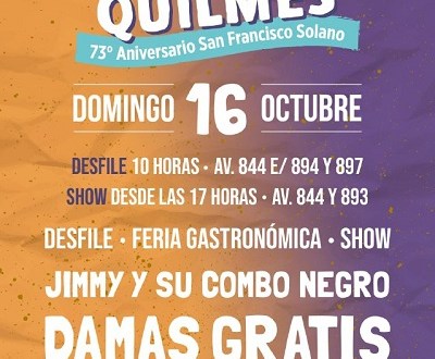 El Municipio de Quilmes invita a los vecinos y a las vecinas a participar de los festejos por el 73º aniversario de San Francisco Solano, que se realizarán el domingo 16 de octubre, durante toda la jornada, y tendrán un cierre a pura cumbia con la presentación de la banda Damas Gratis.