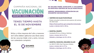 El Municipio de Quilmes informa que continúa hasta el 15 de noviembre la aplicación de la dosis extra de las vacunas triple viral (contra sarampión, rubéola y paperas) e IPV (contra poliomielitis), que deben recibir las niñas y los niños de 13 meses a 4 años inclusive, más allá de las dosis recibidas previamente.