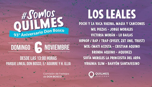 El Municipio de Quilmes invita el domingo 6 de noviembre a los vecinos y vecinas a las celebraciones por el 93º aniversario de Don Bosco, que incluirá el tradicional desfile de instituciones, una feria gastronómica, de emprendedores y cultural, y espectáculos en vivo con magia y shows musicales, en una nueva edición del festival Somos Quilmes, que contará con el cierre a pura música con la reconocida banda de cumbia santafesina, Los Leales.