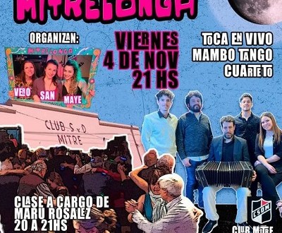 El próximo viernes, 4 de noviembre, el Club Mitre convoca nuevamente a bailar en la noche de la «Mitrelonga». La fiesta tanguera está organizada, como siempre, por Sandra Goñi, Verónica Melluso y la Dj Mayela Aponte, y en esta ocasión, con la actuación en vivo de “Mambo Tango Cuarteto”.
