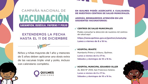 Se extenderá hasta el 11 de diciembre la aplicación de la dosis extra de las vacunas triple viral (contra sarampión, rubéola y paperas) e IPV (contra poliomielitis), que deben recibir niños y niñas mayores de 1 año y menores de 5 años, incluso con calendario completo.