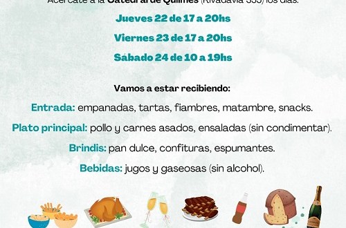 Todas las colaboraciones se recibirán en la Catedral de Quilmes el jueves 22 de diciembre de 17 a 20, el viernes 23 de 17 a 20, y el sábado 24 de 10 a 19.