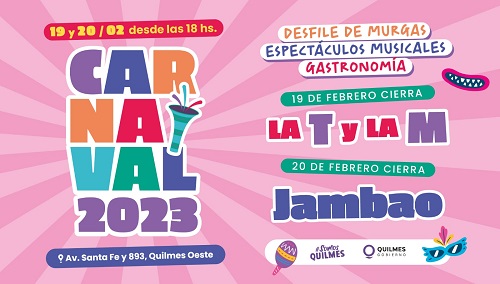 El Municipio de Quilmes invita a los vecinos y las vecinas a participar de los festejos del Carnaval 2023 este domingo 19 y lunes 20 de febrero, en la avenida Santa Fe y calle 893, en el barrio La Paz, de Quilmes Oeste, con música, baile, gastronomía y la presentación de las bandas de cumbia “La T y la M” y “Jambao”.