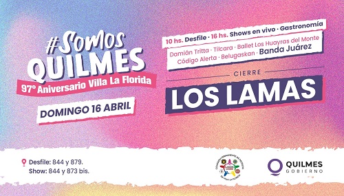 El Municipio de Quilmes invita a la comunidad a participar de una nueva edición del festival “Somos Quilmes”, esta vez, en el marco del 97º aniversario de la localidad de Villa La Florida, que tendrá lugar el domingo 16 de abril.