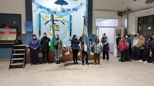 Los adultos portadores de las banderas fueron Pedro Rodríguez; Camila Cejas y María Altana; en tanto que los símbolos provinciales fueron llevados por Noemí Miño; Sara Farías y César Gil. Luego los alumnos del nivel de adultos dirigieron unas palabras alusivas a la gesta de Mayo. Previo a compartir una merienda alusiva a la fecha patria la señora inspectora Cristina Aguirre dirigió un sentido mensaje a los alumnos haciendo hincapié en el compromiso por la educación, la transformación de la sociedad por medio de la formación y los estudios como las instituciones educativas como medios “para que los estudiantes alcancen sus sueños, con trabajo, dedicación y perseverancia”.