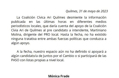 Firmado por la presidenta de oa CC ARI Quilmes, la diputada nacional Mónica Frade, se trasncribe a continuación: "La Coalición Cívica Ari Quilmes desmiente la información publicada en las últimas horas en diferentes medios periodísticos locales, que daría cuenta del apoyo de la Coalición Cívica Ari de Quilmes al pre candidato a intendente, Martiniano Molina, dirigente del PRO local. Hasta la fecha, no ha existido ninguna tratativa entre ambas fuerzas políticas que conduzca a algún apoyo.