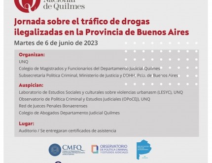 El martes 6 de junio se realizará la Jornada sobre el tráfico de drogas ilegalizadas en la Provincia de Buenos Aires, a las 14 horas en el Salón Auditorio de la Universidad Nacional de Quilmes (UNQ).
