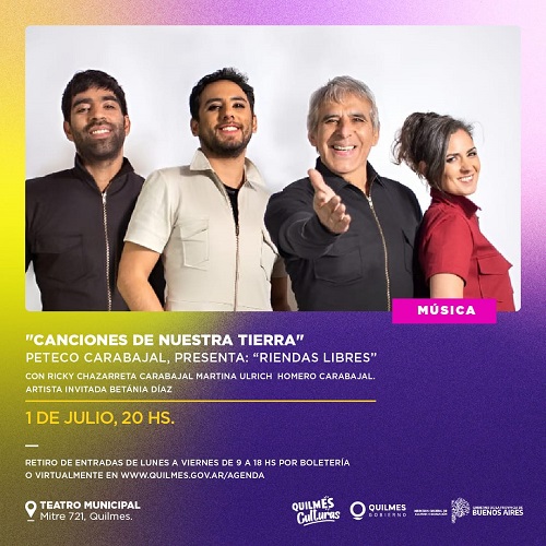 El sábado 1 de julio, a las 16, el Teatro Municipal recibirá al Concierto de Coros y Orquestas, con la actuación de La Orquesta de Don Bosco, La Sonora del Río, el Coro Lloverán Cantares y el Coro de Pony, que se reunirán para brindarnos este hermoso momento. Mientras que a las 20, se podrá disfrutar de «Riendas Libres», en el Ciclo “Canciones de Nuestra Tierra”. Un proyecto que cumple 5 años y que está integrado por Peteco Carabajal, junto a Ricky Chazarreta Carabajal, Martina Ulrich y Homero Carabajal. En esta fiesta de chacareras y folclore argentino tendrá la participación de Betania Díaz, la destacada cantante nacional.