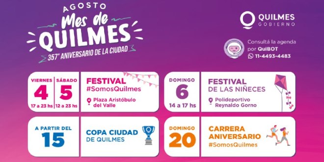 Para más información, consultar la agenda del “Mes de Quilmes” en la página web de la Municipalidad (www.quilmes.gov.ar) o a través de QuiBOT, la nueva y eficaz herramienta de ayuda virtual, ya sea de manera digital por la página web o por WhatsApp al 11-4493-4483.