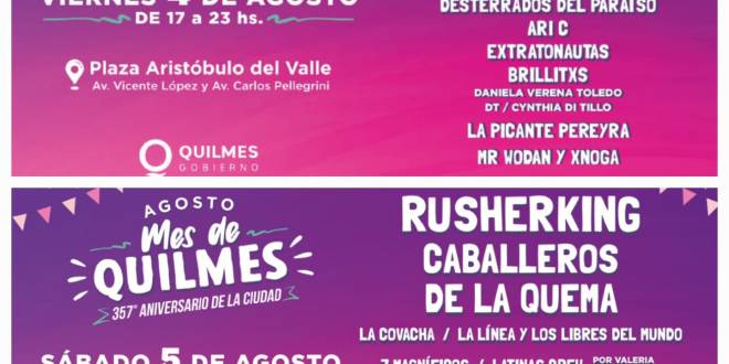 El viernes 4 y el sábado 5 de agosto, se desarrollará el festival “Mes de Quilmes”, por el 357º aniversario de la ciudad, en la plaza De las Colectividades (Aristóbulo del Valle), ubicada en las avenidas Vicente López y Carlos Pellegrini, en Quilmes Oeste, donde se presentarán reconocidas bandas y artistas como Kapanga, Vox Dei, Rusherking y Caballeros de la Quema, entre otros.