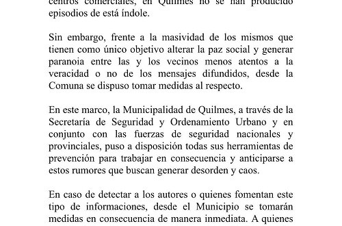 El Municipio de Quilmes emitió un comunicado en el que hace referencia a la difusión de mensajes y falsas noticias, principalmente en redes sociales sobre supuestos saqueos a centros comerciales que tienen como objetivo «alterar la paz social». La comuna tomó medidas al respecto.