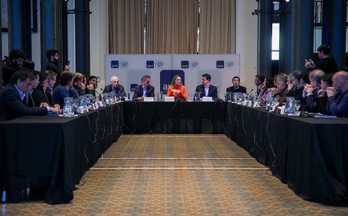 La presidenta de AySA, Malena Galmarini junto al Ministro del Interior, Eduardo “Wado” de Pedro; el Ministro de Obras Públicas de la Nación, Gabriel Katopodis y el Secretario General de SGBATOS, José Luis Lingeri, presentaron a los intendentes del área de concesión el Plan de Mejoras, Operación, Expansión y Mantenimiento de los Servicios 2024-2028 (PMOEM). El plan tiene por objetivo optimizar los servicios prestados en el radio servido y expandir las redes de agua y cloacas. Este evento se llevó adelante en el Palacio de las Aguas Corrientes y contó con la presencia de autoridades nacionales, provinciales y municipales.