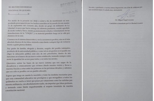 Por medio de la presente me dirijo a usted a fin de manifestarle mi más profunda preocupación por los hechos acaecidos en la jornada de este martes 12 de septiembre del corriente año, donde un grupo de militantes de La Libertad Avanza que hacía entrega de folletería partidaria, resultó agredido de modo verbal y físico, siendo posteriormente echados violentamente de las inmediaciones de la “UNQ” y su material prendido fuego en la calle por alumnos de la casa.