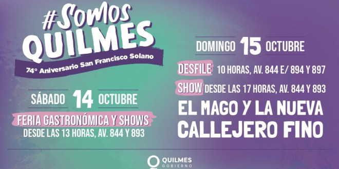 El Municipio de Quilmes invita a las vecinas y vecinos a celebrar el 74º aniversario de San Francisco Solano, que el sábado 14, desde las 13, contará feria gastronómica y shows; mientras que el domingo 15, a partir de las 10, tendrá el desfile cívico tradicionalista; la feria gastronómica y de emprendedores locales, y a las 17, se llevará adelante una nueva edición del festival Somos Quilmes, con entrada libre y gratuita, con música en vivo y que tendrá un final a pura cumbia con El Mago y La Nueva, el cierre estelar con el RKT de Callejero Fino.