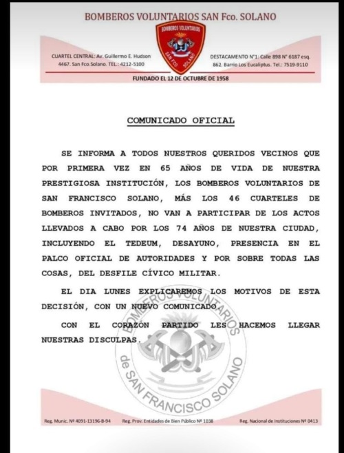 Los bomberos voluntarios de Solano emitieron un comunicado en el que anunciaron que por primera vez, en 65 años de vida de la institución, no participarán del desfile en el marco del 74° aniversario de la ciudad que se realizará mañana domingo desde las 10 por la avenida 844. Asimismo no irán al tradicional desayuno, al Te Deum ni subirán al palco oficial.