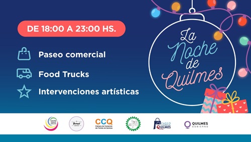 El Municipio de Quilmes informa que desde el martes 19 de diciembre al viernes 22 se llevará adelante “La Noche de Quilmes” en los principales centros comerciales del distrito, en los que nuevamente las vecinas y los vecinos podrán realizar las compras y regalos de Navidad con descuentos y rebajas. Cada localidad tendrá asignada una jornada, en el horario que va de las 18 a las 23. Además, habrá beneficios especiales para los poseedores de la tarjeta Somos Quilmes.