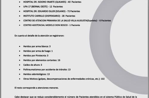 La Secretaría de Salud de Quilmes informó que entre las 8 de la mañana del 24 de diciembre y hasta las 8 de hoy recibieron a 171 pacientes en el Sistema Público de Salud.