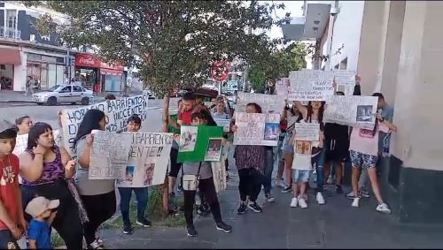 Familiares de Horacio Barrientos, un vecino detenido días atrás tras un allanamiento en el marco de una investigación que desarticuló una banda que realizaba entraderas en Quilmes se manifiestan frente a los Tribunales Penales de Yrigoyen y Videla.