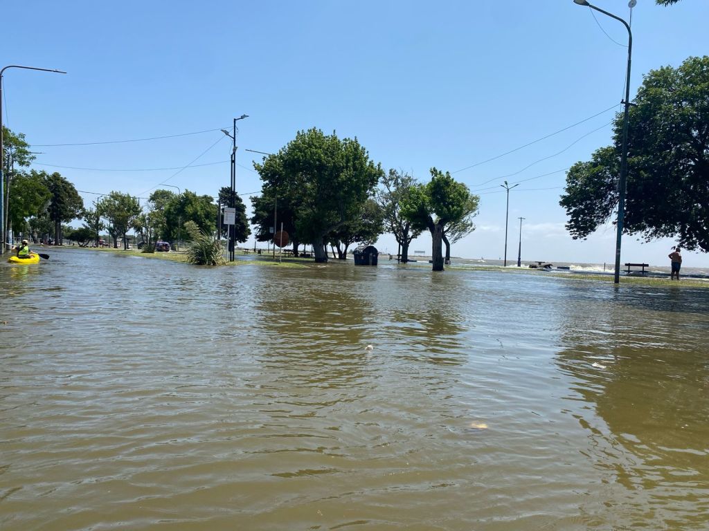 La avenida Cervantes y parte de Otamendi están totalmente anegadas tras la salida del río ocurrida alrededor de las 10 de éste domingo, cuando gran cantidad de gente disfrutaba de la jornada de sol y calor en la costanera.
